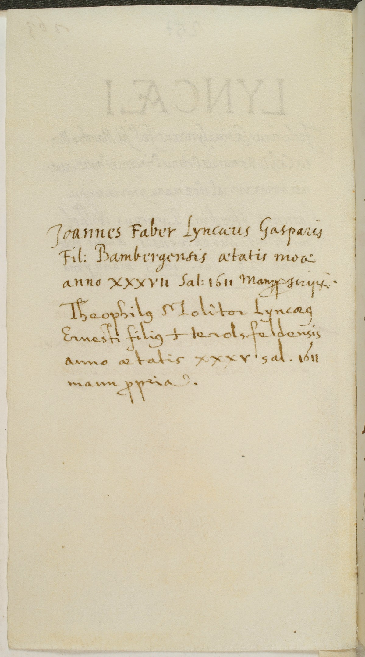 Il manoscritto, che contiene l’atto di sottoscrizione autografa dei primi lincei (carta 246r), riporta, su due carte distinte (244r e 245v), l’emblema dell’Accademia, la lince. L’animale, prescelto per la sua “oculatissima vista”, era quello che meglio avrebbe simboleggiato l’impresa lincea, tesa sin dal primo momento a privilegiare l’osservazione diretta, l’observatio e la contemplatio, che dovevano di necessità sottendere ogni scritto linceo destinato alle stampe.